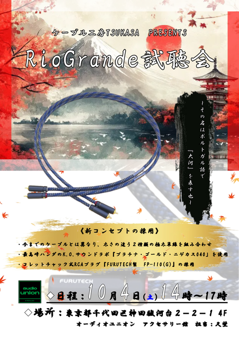 当日は、新製品の「RCAケーブル RioGrande」をじっくりとお聴きいただきたいと思っております。